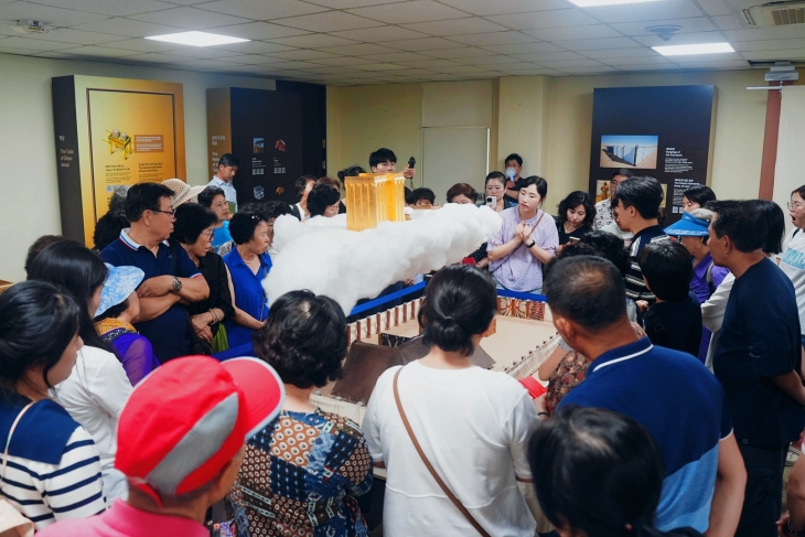 幕屋の展示会で説明を聞く参加者たち