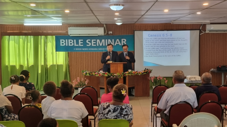 ソロモン諸島のグッドニュースホニアラ恩恵教会は、11月11日(火)からチャンウォン教会のチャン・ヒョンスン牧師と、イリョン教会のオ・ジュンホ牧師を招いて聖書セミナーを開催した。セミナー後にはカルチャーダンス・フェスティバルをはじめ、青少年部長官との面談、メソジスト教会の事務総長との面談、矯正局でのマインド教育など、多方面で福音を伝える活動が続いた。